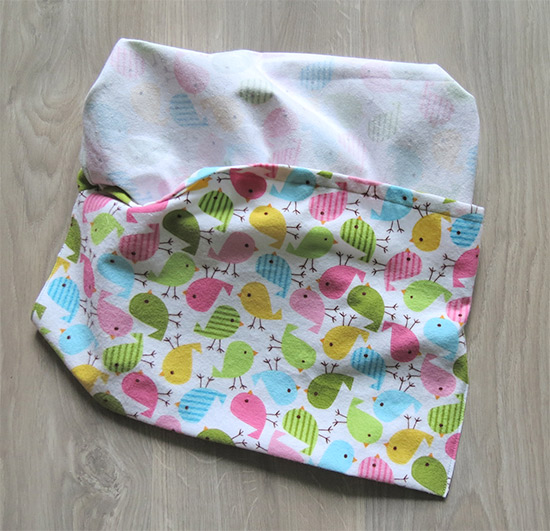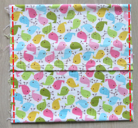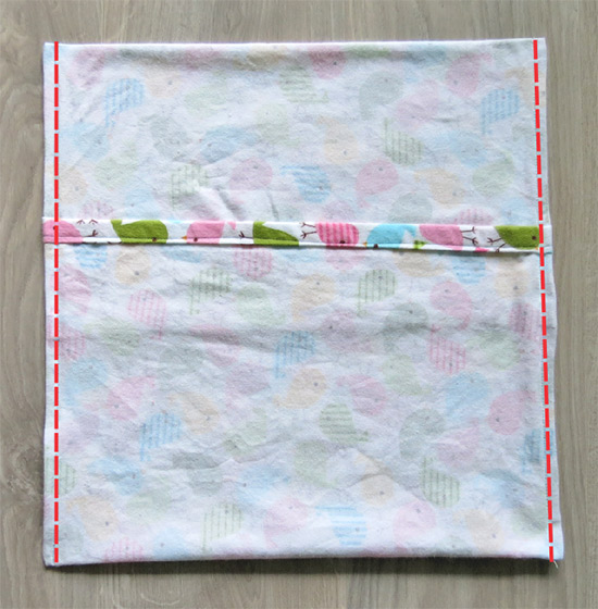 Keep the piece with the inside up (like in the photo above); fold the piece in half as shown, keeping all the edges aligned; stitch the 2